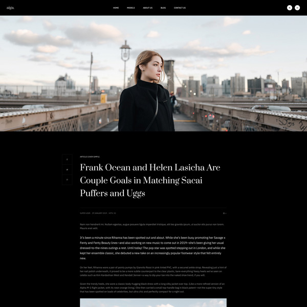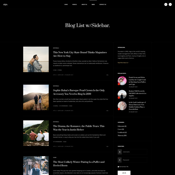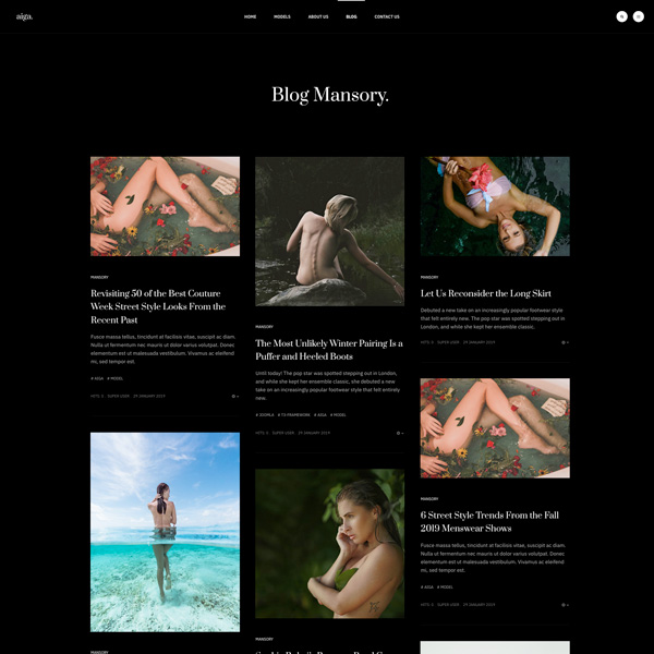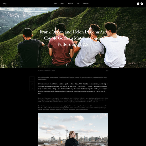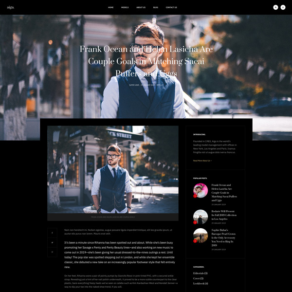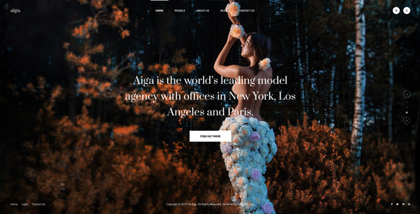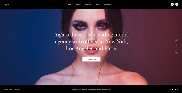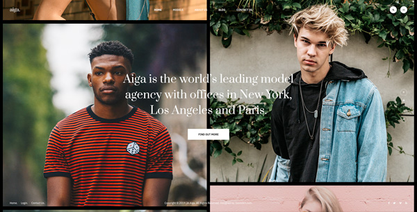 Founded in 1983, Aiga is the world’s leading model management with offices in New York, Los Angeles and Paris. Nam sodales purus ristique, pretium leo et, suscipit leo. Aliquam interdum feugiat congue dolo estibulum era dimentum quis urna non, dolor rhoncus pretium ipsum.